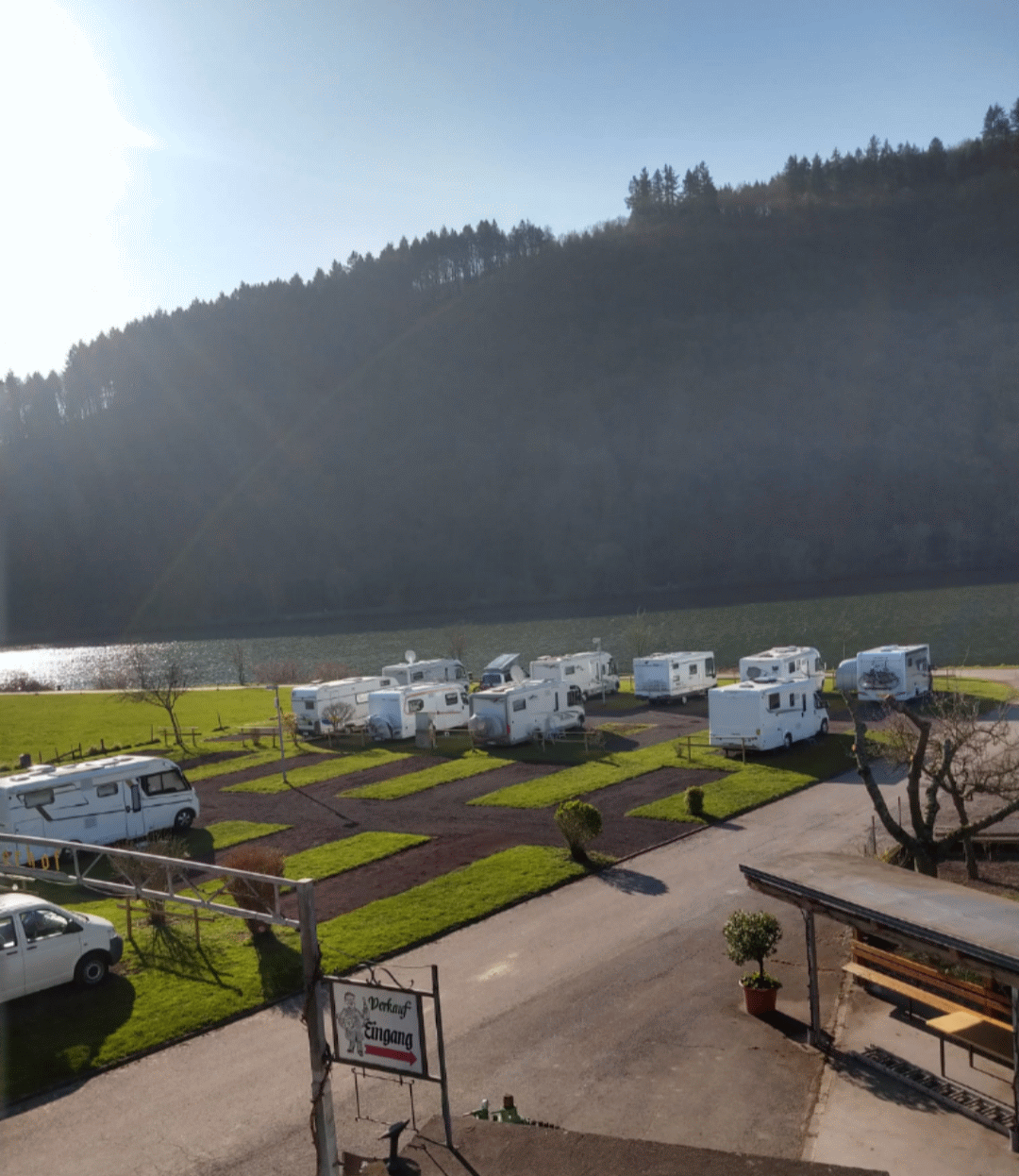 Der Wohnmobil­stellplatz liegt in direkter Mosellage, in Mehring an der schönen Mosel. Hier werden Ihnen insgesamt 43 Stellplätze mit Stromanschluss und einer tollen Aussicht auf die Mosel und den gegen­über­liegenden Wald geboten.