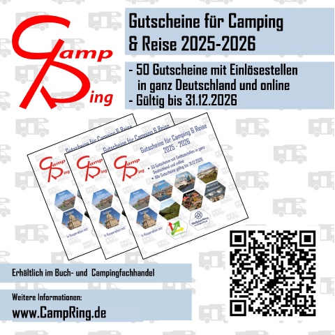 Gutscheine für Camping & Reise 2025-2026 - 50 Gutscheine mit Einlösestellen in ganz Deutschland und online - Gültig bis 31.12.2026 Erhältlich im Buch- und Campingfachhandel Weitere Informationen: www.CampRing.de