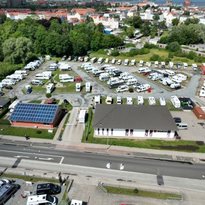 130 Mobile finden Platz auf dem extra für Wohnmobile angelegtem Gelände. Die befestigten Parzellen, mindestens 9,50 x 4,50 m groß, sind zum Teil mit Rasengitter und zum Teil mit Schotterrasen belegt und verfügen über Stromanschlüsse. Für die Ver- und Entsorgung gibt es eine zentrale Stelle. Die sanitären Anlagen mit WC und Duschen sind sehr gepflegt. Täglich kann man frische Brötchen kaufen. Informationen über die Umgebung gibt es in der Rezeption. Der Platz ist für große Mobile gut geeignet. Gezahlt wird am Automaten. Der Platz liegt in Sichtweite der Rügenbrücke.