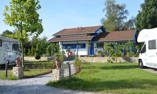 Der Reisemobil-Stellplatz wurde von Reisemobilisten für Reisemobilisten errichtet. Er bietet Platz für 52 Mobile auf befestigten, geschotterten Untergrund mit anschließender Rasenfläche. Alle Plätze verfügen über einen Stromanschluss. Die Ver- und Entsorgungsstelle kann gut angefahren werden. Im Servicehaus findet man sehr gepflegte sanitäre Anlagen und die Rezeption. Brötchenservice und W-Lan runden das Angebot ab.