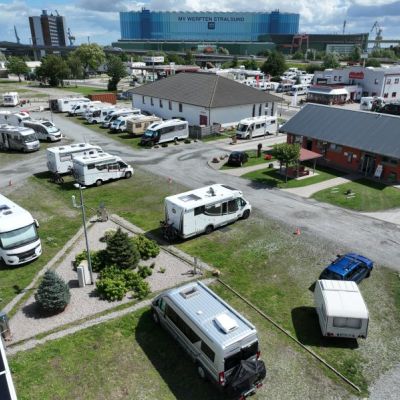 130 Mobile finden Platz auf dem extra für Wohnmobile angelegtem Gelände. Die befestigten Parzellen, mindestens 9,50 x 4,50 m groß, sind zum Teil mit Rasengitter und zum Teil mit Schotterrasen belegt und verfügen über Stromanschlüsse. Für die Ver- und Entsorgung gibt es eine zentrale Stelle. Die sanitären Anlagen mit WC und Duschen sind sehr gepflegt. Täglich kann man frische Brötchen kaufen. Informationen über die Umgebung gibt es in der Rezeption. Der Platz ist für große Mobile gut geeignet. Gezahlt wird am Automaten. Der Platz liegt in Sichtweite der Rügenbrücke.