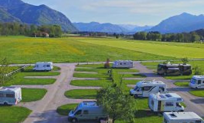 Die großzügigen Stellplätze, insgesamt 28 Stück, sind auf Rasen mit befestigten Standspuren.