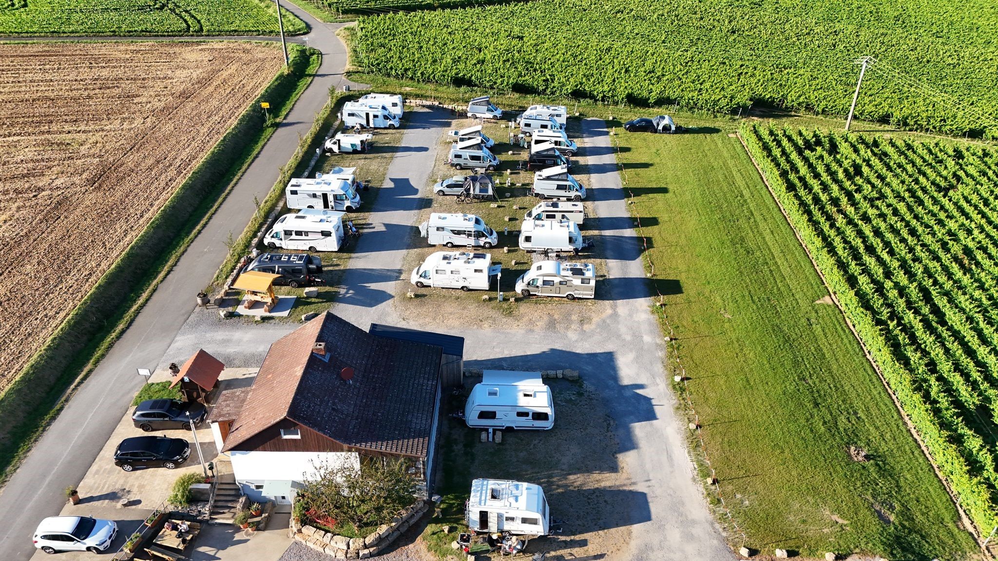 Der Panoramastellplatz liegt direkt am Weingut, eingebettet in Rebflächen und mit einer spektakulären Aussicht von Sonnenauf- bis Sonnenuntergang.